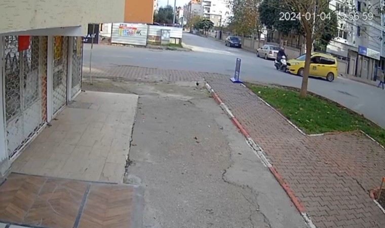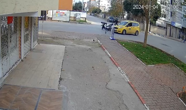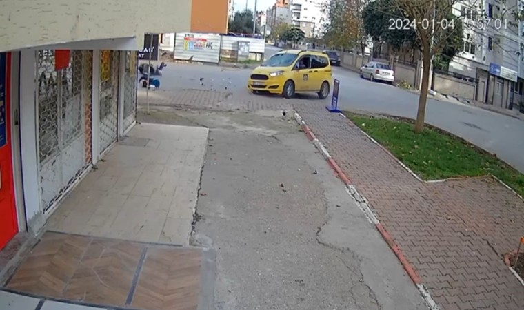 Kaza, dün saat 16.00 sıralarında Muratpaşa ilçesi Yenigün Mahallesi’nde meydana geldi. Alınan bilgiye göre; Serhan A. kontrolünde bulunan 35 KE 058 plakalı motosikletle Ramazan T. kontrolünde bulunan 07 T 1237 plakalı ticari taksi kontrolsüz kavşakta çarpıştı. Çarpışmanın şiddetiyle motosiklet sürücüsü genç, ileriye uçtu. Kazanın ardından ihbarla bölgeye polis ve sağlık ekipleri sevk edildi. Kazada yaralanan motosiklet sürücüsünün ilk tedavisi olay yerinde yapıldı. Kaza anlar ise işyerinin güvenlik kamerası tarafından saniye saniye kaydedildi. Görüntülerde ticari taksi ile çarpışan motosiklet sürücüsünün ileriye uçtuğu anlar yer aldı.