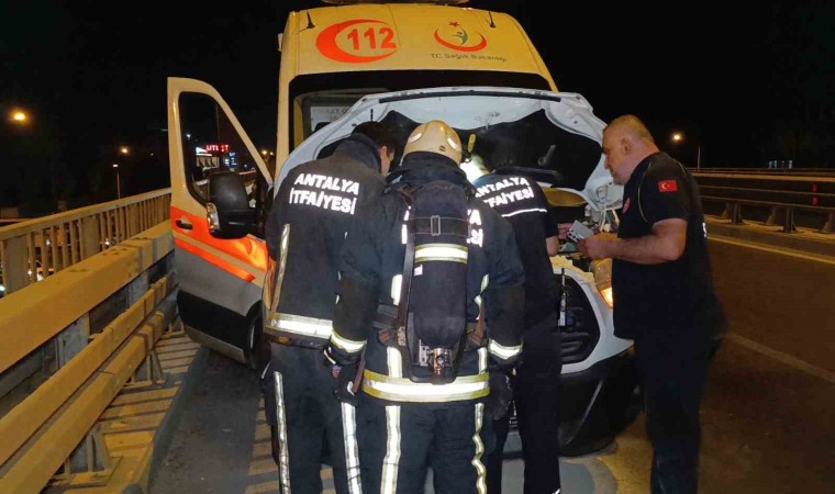 Antalya’dan Akseki’ye gitmekte olan ambulans, motorunun alt kısmından yanmaya başladı. Diğer sürücülerin uyarısı sonucunda ambulansı durdurarak kaputunu açan ambulans şoförü, yangın tüpüyle yangını söndürdü.