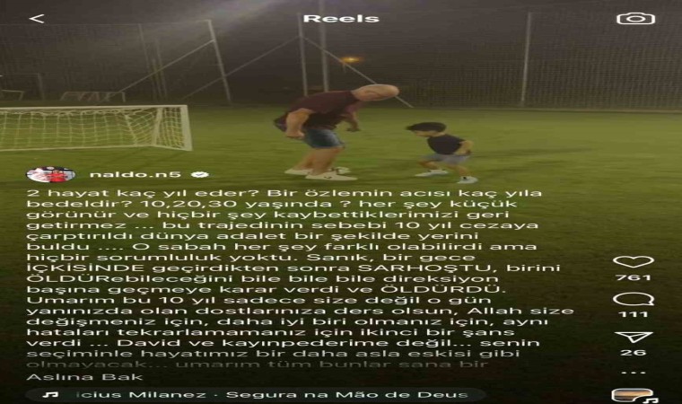 Karar sonrası sosyal medya hesabından defalarca paylaşım yapan ve acısını takipçileriyle paylaşan Naldo, bu sabaha karşı saat 03.00’da bu kez oğlunun ve kayınpederinin birlikte halı sahada futbol oynadığı videoyu paylaştı. Sevdiklerinin ölümüne sebep olan sürücüye de seslenen Naldo’nun ağlatan mesajında şu sözlere yer verdi: