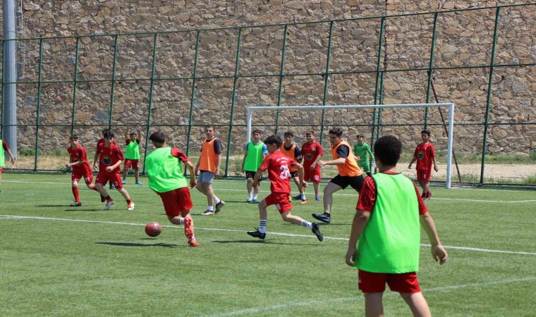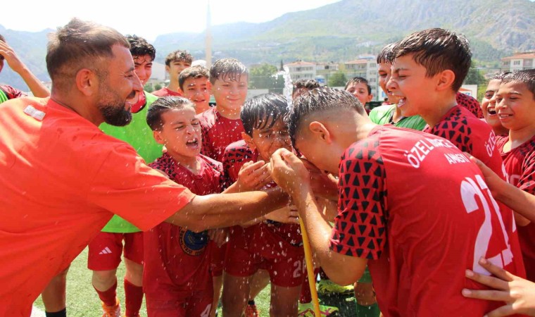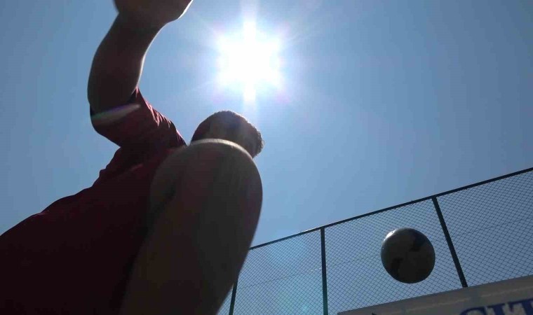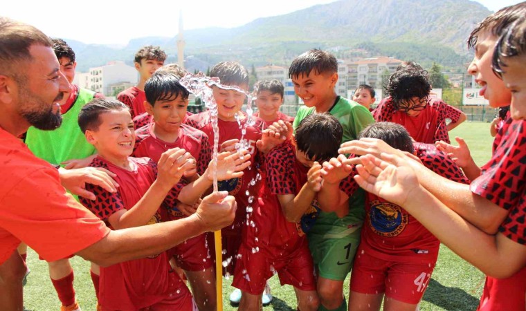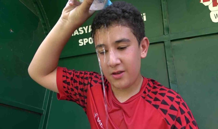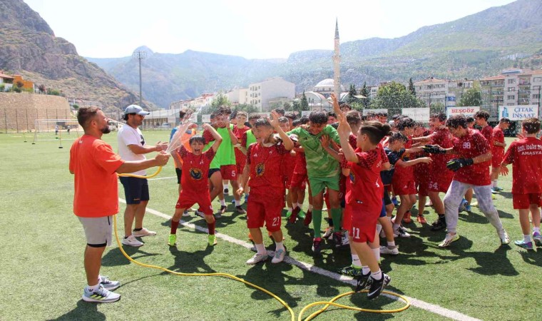 Amasya’da sıcak havada antrenman yapan küçük futbolcular antrenörlerinin hortumla üzerlerine püskürttüğü suyla serinliyor. Böylece hem serinleyip hem de eğleniyorlar.