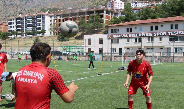 Amasya Özel İdarespor’un gelecek vaat eden futbolcuları için antrenmanda güneşli havada sıcaklara karşı 10 dakika aralıklarla su ve serinleme molası veriliyor. Saha kenarından çekilen hortumun önüne gelen sporcular üzerlerine yöneltilen hortumdan akan suyla serinleme fırsatı buluyor.
