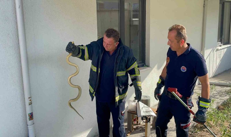 Karabük’te bir apartmanın bahçesine giren yılan, itfaiye ekipleri tarafından yakalanarak doğaya salındı.