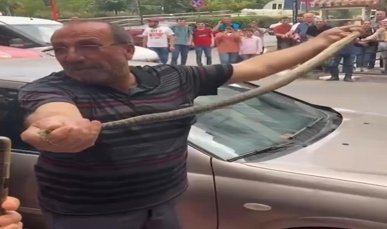 Manisa’nın en merkezi noktası olan Valilik binası önünde park halindeki bir arabanın jantlarının arasında fark edilen bir yılan, çevreden geçen vatandaşlara korkulu anlar yaşattı. Vatandaşlar birbirlerine yılanı gösterirken, korkusuz bir vatandaş arabanın tekerlerine doğru eğildi ve sıkışmış yılanı yerinden çekerek çıkardı. Vatandaş ağzındaki sigarasını bırakma gereği bile duymadan korkusuzca yılanın kuyruğunu tuttu ve havaya kaldırarak çevredekilere gösterdi. Bazı vatandaşlar bu cesur hareketi alkışlarken, çevreden "Adamdaki cesarete bak. Helal olsun sana" dedi. Cesur vatandaş ise çıkardığı yılana bakıp “Hay maşallah", diyerek yaklaşık 1 metre boyundaki hayvanın uzunluğuna dikkat çekti.