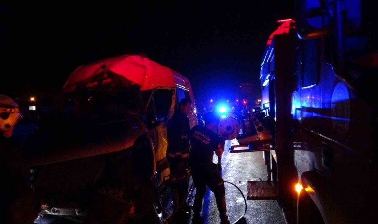 Antalya’da meydana gelen trafik kazasında tır ile çarpışan minibüs sürücü sıkıştığı araçtan yaralı olarak çıkartılarak hastaneye kaldırıldı.