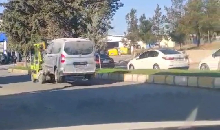 Şanlıurfa’da kameralara ilginç bir görüntü yansıdı. Evren Sanayi Sitesi içerisinde çekilen görüntülerde hasarlı bir hafif ticari aracın forklift yani çatallı kaldıraç ile taşındığı gözlendi. Ticari aracın yüklü olduğu forkliftin normal bir şekilde trafikte ilerlemesi pes dedirtti.