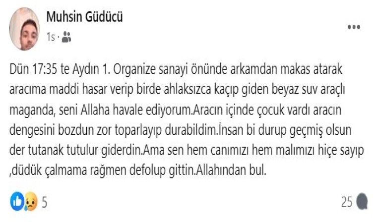 Aydın’ın Efeler ilçesinde, seyir halindeyken iddiaya göre makas atan bir aracın içerisinde ailesinin de bulunduğu otomobiline çarpıp kaçtığını belirten Muhsin Güdücü, plakasını alamadığı sürücüye sosyal medya hesabından yaptığı paylaşım ile tepki göstererek, "Allah’ından bul" dedi.