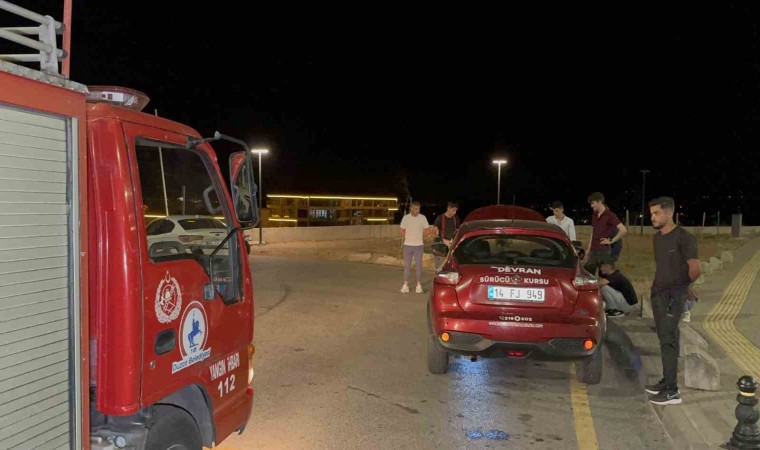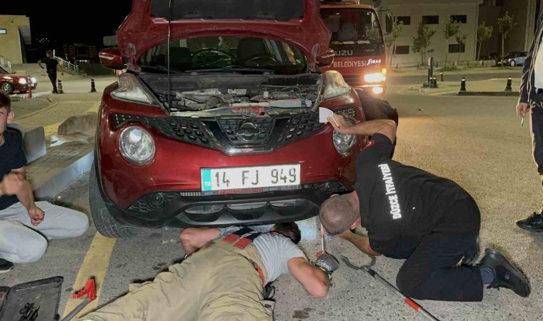 Olay, Konuralp bölgesinde meydana geldi. Alınan bilgilere göre arkadaşları ile birlikte hastane otoparkında bir aracın kaputundan miyavlama sesi duyan Mehmet Dinç, durumu itfaiye ekiplerine bildirdi. İhbar üzerine bölgeye gelen ekipler araç içerisindeki kedinin çıkartılması için çalışma başlattı. Fakat yavru kedi tam kurtarılacağı esnada başka bir aracın kaputundan içeri girdi. Yavru kedi uzun uğraşlar sonucu bulunduğu yerden çıkarılamayınca, aracın camına “Dikkat edin. Motorda kedi var” yazısı yazıldı. Araç içerisinde kedi sesini duyar duymaz itfaiye ekiplerine haber verdiklerini belirten Mehmet Dinç, “Beçi’ye geldik arkadaşlarım ile gezmeye. Arka arabada miyavlama sesi vardı. Arabanın altına eğilip baktığımızda çıkmayacak bir yerdeydi, biz de itfaiyeyi aradık hemen. Ekipler geldi hemen müdahale ettiler. Diğer arabaya girdi ama oradan çıkaramadık. Büyük ihtimalle kendisi çıkar herhalde” şeklinde konuştu.