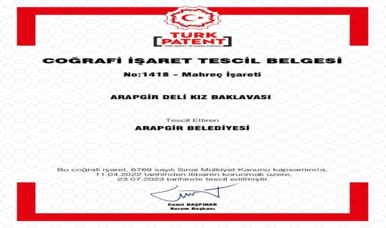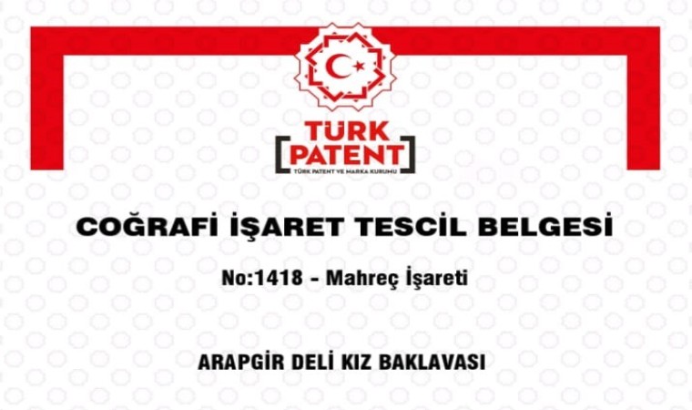 Arapgir’in Coğrafi İşaretli ürünlerine bir yenisi daha eklendi. Arapgir’in Mor Reyhanı, Köhnü Üzümü, Tandır Kebabı, Arapgir Dolaması, Arapgir Akıtma Bıciği, Arapgir Pohmutu, Arapgir Kakuk’unun ardından “Arapgir Deli Kız Baklavası” Türk Patent ve Marka Kurumu’nun onayıyla tescillendi.