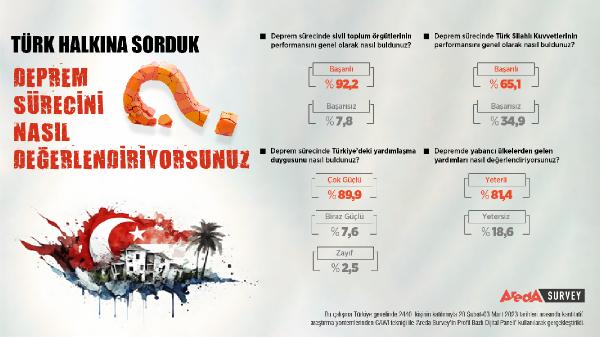 İSTANBUL, (DHA) - Areda Survey adlı araştırma şirketi tarafından yapılan Deprem ve Yardım araştırmasına göre, katılımcıların yüzde 92,2'si deprem sürecinde sivil toplum kuruluşlarının performansını başarılı buluyor.