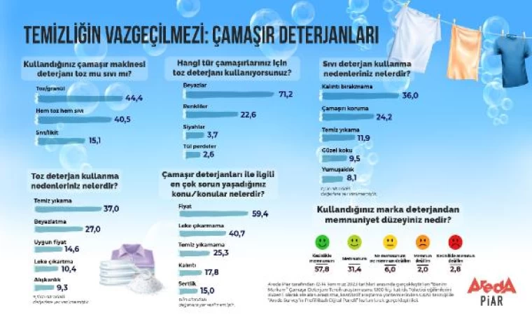 Araştırmada tüketicilerin çamaşır deterjanlarına yönelik yaşadığı sorunlarda yüzde 59,4 ile fiyat ve yüzde 40,7 ile leke çıkarma durumu öne çıkıyor. Tüketicilerin yüzde 25,3'ü temiz yıkamadığı için, yüzde 17,8'i kalıntı, yüzde 15'i sertlik ve yüzde 10,9'u alerji/cilt tahrişi konularında sorun yaşadığını belirtiyor.