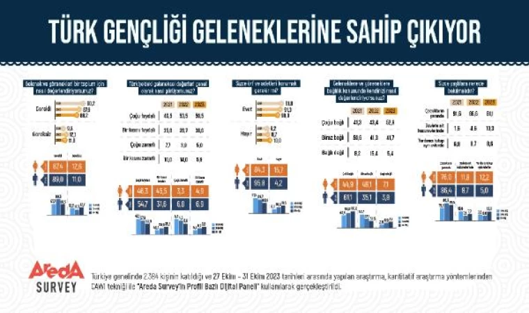 2023 yılı araştırmasına göre Türk toplumunun yüzde 90’ı, örf ve adetleri korumanın gerekli ve önemli olduğuna inanıyor. Bu oran 2021 yılında yüzde 91,8 iken, 2022 yılında yüzde 91,3’e gerilediği görülüyor.
