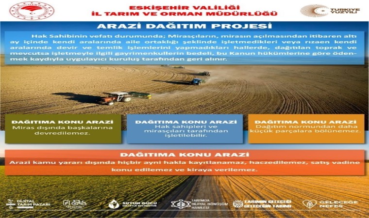 Eskişehir İl Tarım ve Orman Müdürlüğü Tarımsal Altyapı ve Arazi Değerlendirme Şube Müdürlüğü teknik personelince, Tarım ve Orman Bakanlığı Tarım Reformu Genel Müdürlüğü’nün talimatları doğrultusunda, topraksız ve az topraklı çiftçi ailelerine toprak dağıtım projesinin uygulandığı Günyüzü İlçesine bağlı Ayvalı, Mercan Mahalleleri; Mahmudiye İlçesine bağlı Kaymazyaylası Mahallesi; Mihalıççık İlçesine bağlı Ahurözü Mahallesi; Sivrihisar İlçesine bağlı Ahiler, Aydınlı, Biçer, Demirci, Göktepe, Hamamkarahisar, Kaldırım, Kurtşeyh, Mülk ve Ortaklar mahallerinde arazi kontrolleri ve çiftçi bilgilendirme toplantıları gerçekleştirildi. Söz konusu proje çerçevesinde, il genelinde 4 ilçe 14 mahallede ‘3083 sayılı Sulama Alanlarında Arazi Düzenlenmesine Dair Tarım Reformu Kanunu’ çerçevesinde Arazi Dağıtım Projesi tamamlanarak, bin 60 hak sahibi çiftçiye 105 bin 855 Hazine Arazisi dağıtımı gerçekleştirildi. Günyüzü ilçesi Kayakent Mahallesi’nde ise dağıtım çalışmalarına devam edildiği bildirildi.