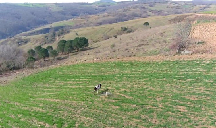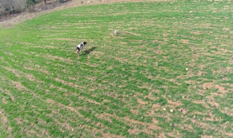 Kocaeli İzmit ilçesinde bir vatandaş, arazisine giren ineği dronla kovaladı. O anlar dronun kamerasına anbean yansıdı.
