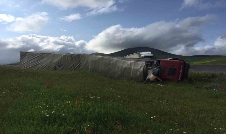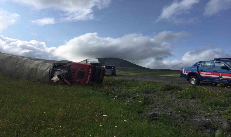 Ardahan’ın Posof ilçesinde sürücüsünün kontrolünden çıkan tır devrildi.