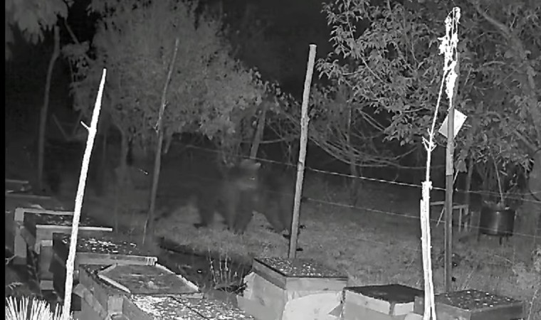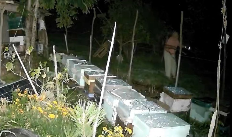 Bolu’da bir arı üreticisinin kovanlarının etrafına kurduğu elektrikli tel sistemi, balları yemeye gelen ayıları geri püskürttü. O anlar saniye saniye güvenlik kameralarına yansıdı.