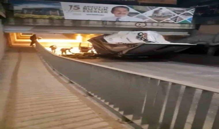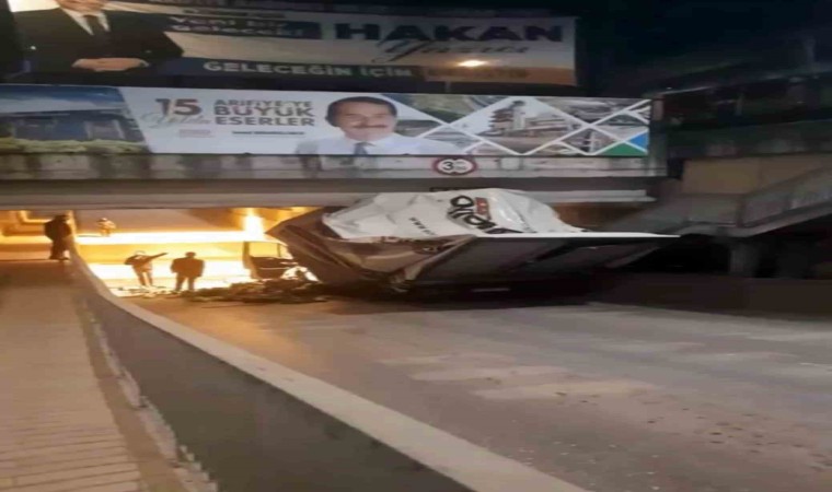 Sakarya’nın Arifiye ilçesinde bulunan 3 metre yükseklikteki alt geçide bu kez ise bir kamyonet sıkıştı. Alt geçide hızla giren kamyonetin kasası paramparça oldu.