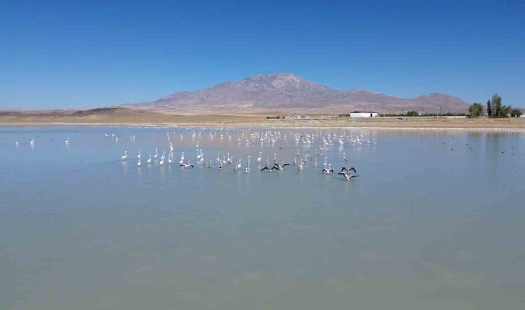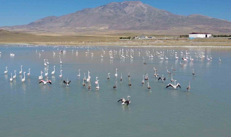 Bitlis’in Adilcevaz ilçesinde bulunan Arin Gölü’nün sığ alanlarında konaklayan flamingolar, kartpostallık görüntüler oluşturuyor.