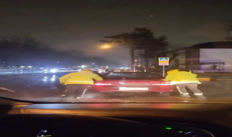 Sakarya’nın Adapazarı ilçesinde seyir halindeyken arızalanan otomobilin, trafik polisleri tarafından yağmur altında itilme anı cep telefonu kamerası ile kaydedildi.