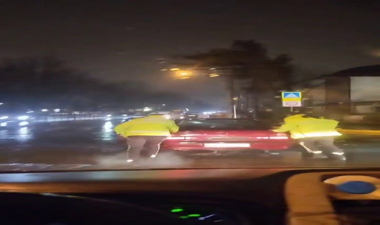 Şeker Mahalle’de sürücüsünün kimliği öğrenilemeyen seyir halindeki otomobil arızalandı. Durumu fark eden trafik polisleri, yağışın etkisiyle yoğunlaşan trafik akışını rahatlatmak için otomobili bir süre iterek sürücüye yardımcı oldu. Trafik polislerinin yağmur altında gösterdiği duyarlılık takdir toplarken, o anlar ise cep telefonu kamerası ile kaydedildi.