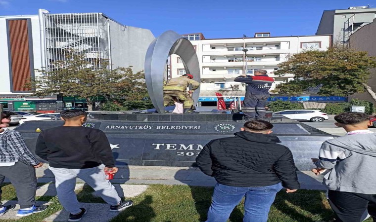 Arnavutköy’de Şehitler Anıtı’na düşürdüğü parasını almak için giren bir çocuk, orada mahsur kaldı. İtfaiye ekipleri tarafından mahsur kalan çocuk anıttan çıkarılırken, o anlar cep telefonu kamerasına yansıdı.