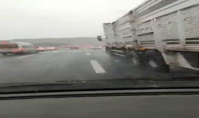 Arnavutköy’de kar yağışının başladığı esnada önünde oluşan trafikten kurtulmak için ani şerit değiştiren bir otomobile, seyir halinde olan kamyonet çarptı. Kaza anı cep telefonu kamerasıyla görüntülendi.