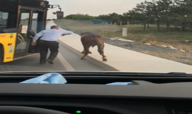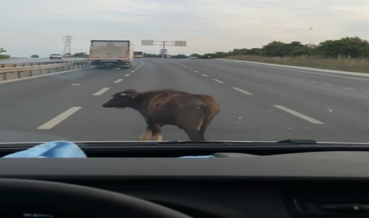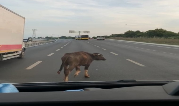 Arnavutköy’de yola çıkan manda yavrusu, trafiği birbirine kattı. Kilometrelerce yol kat eden manda yavrusunu, bir sürücü araç çarpmaması için takip ederken o anlar cep telefonu kamerasına yansıdı.