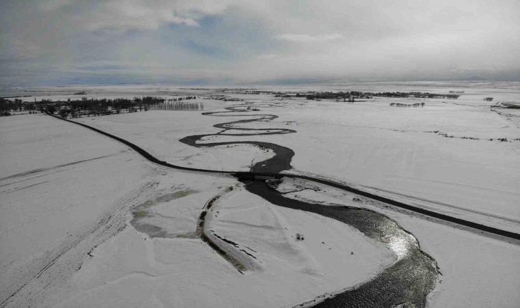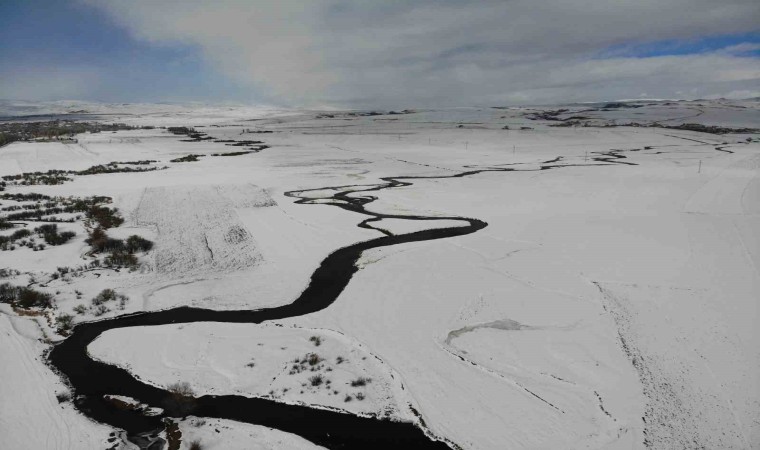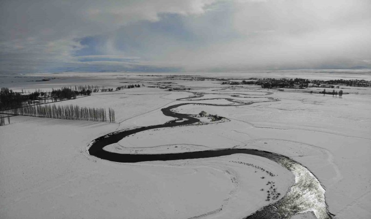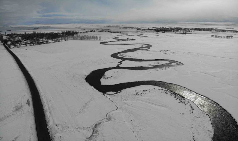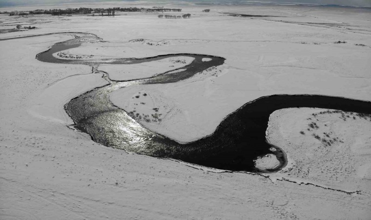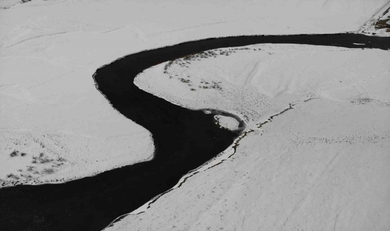 Mendereslerin yılan gibi kıvrımları, beyaz karla birleşerek eşsiz bir görsel şölen oluşturuyor. 4 mevsim bir başka güzelliğe bürünen menderesler havadan görüntülendi.