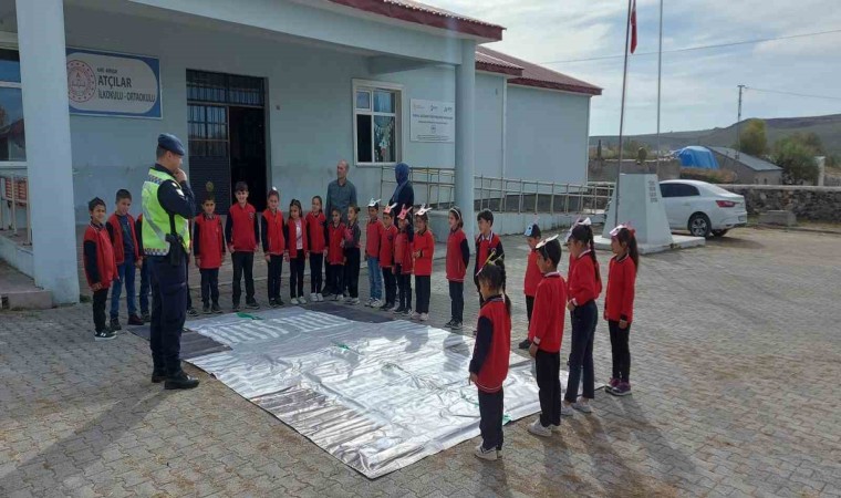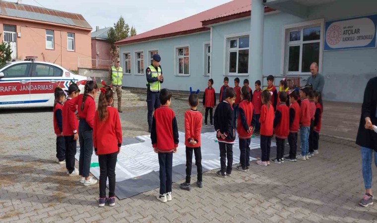 Kars’ın Arpaçay ilçesi Atçılar köyü ilkokulu öğrencileri jandarma ekiplerince karşıdan karşıya geçiş, önce yaya uygulaması, trafik levhaları ve anlamları, okul servis aracı biniş-iniş kuralları ve emniyet kemerinin önemi konularında bilgilendirildi.