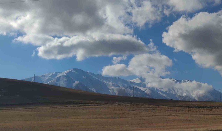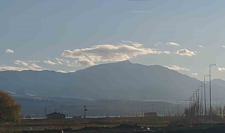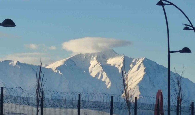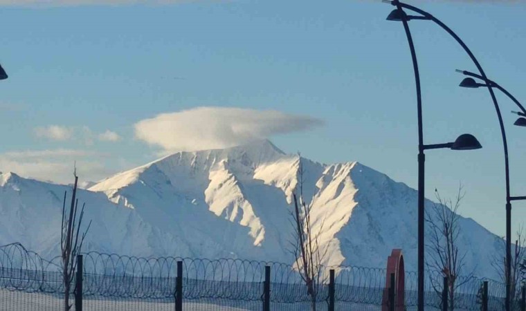 Van’ın Gevaş ilçesinde 3550 rakımlı Artos Dağı’nın karlı zirvesinde şapka şeklinde mercek bulutu oluştu.