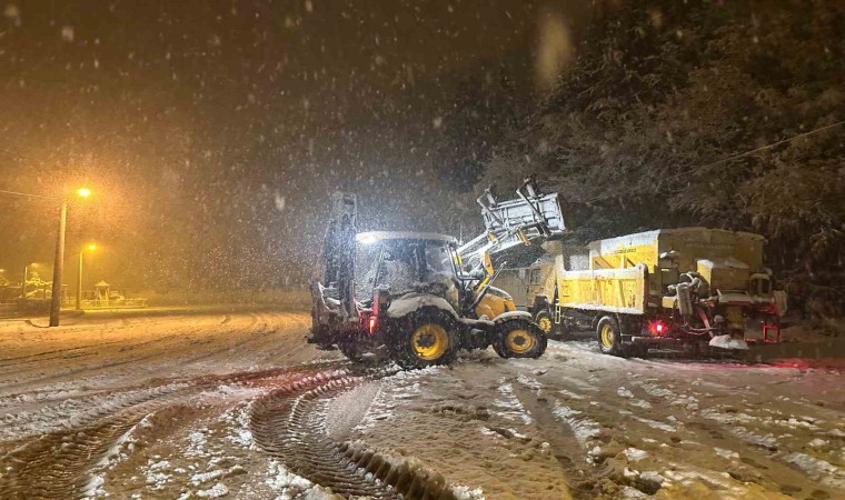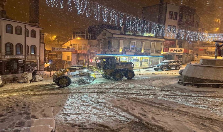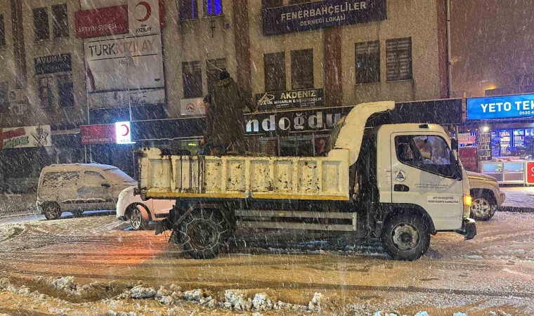 Artvin’de akşam saatlerinde etkili olan kar yağışı sonrası şehrin cadde ve sokakları beyaza büründü, belediye ekipleri gece kar mesaisine başladı.