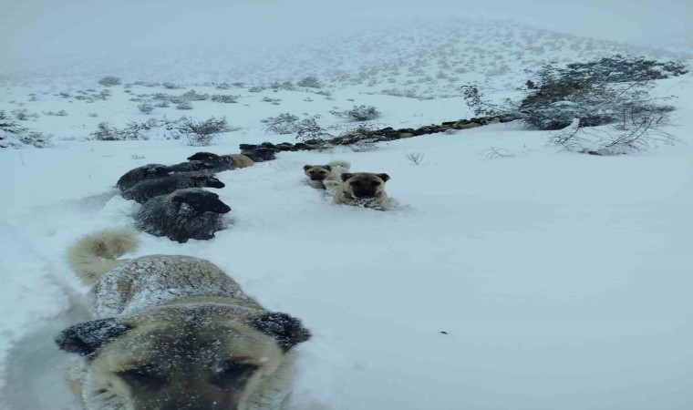 Görüntülerde çobanın açtığı karlı patika yolda koyun ve keçiler tek sıra halinde ilerliyor, aynı zamanda kar altında kalmayan bitkilerden beslenmeye çalışıyor.