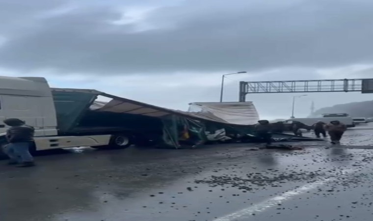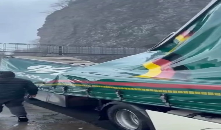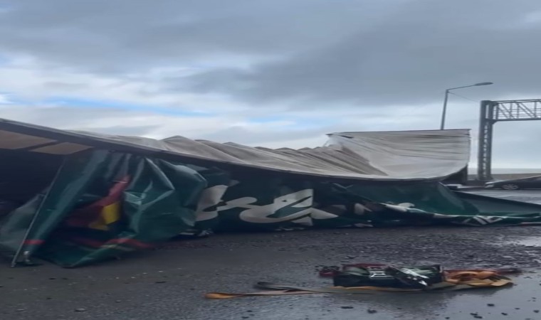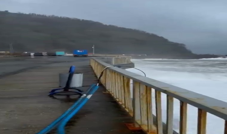 Fırtına Doğu Karadeniz Bölgesi’nde dün akşamdan bu yana etkisini sürdürüyor. Artvin’in Kemalpaşa ilçesinin Sarp Sınır Bölgesi yakınlarında sahilde park halinde bulunan bir tırın dorsesi dev dalgaların gazabına uğradı. 10 metreyi bulan duvara aşan dalgalar park halindeki tırın dorsesini parçalarken, maddi hasar oluştu.