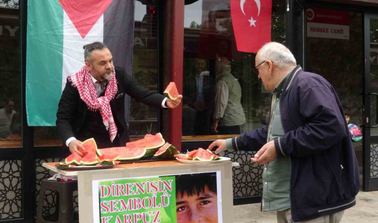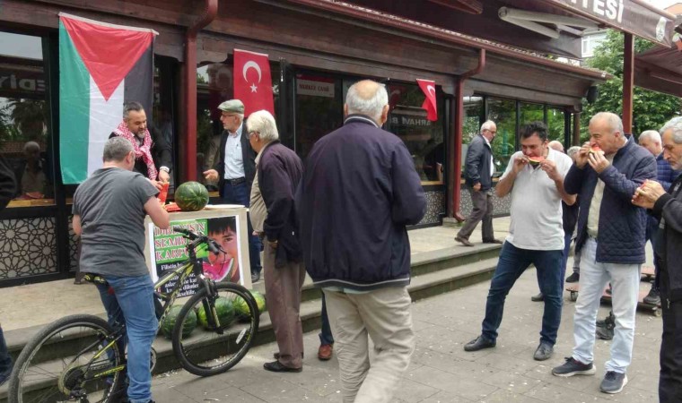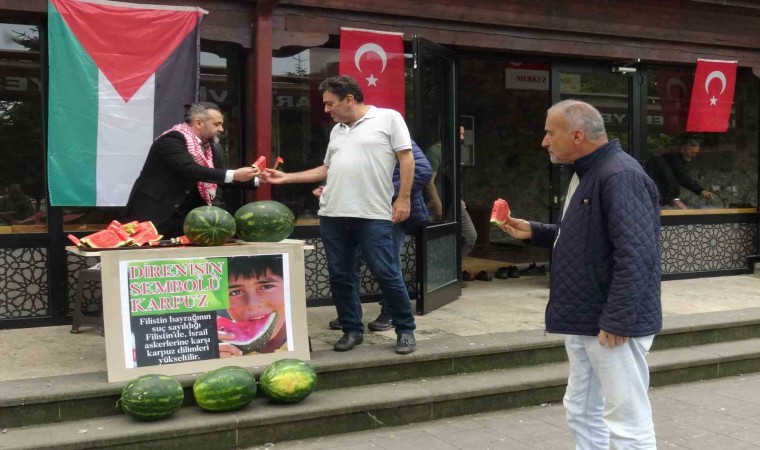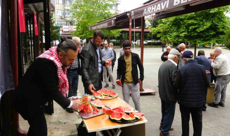 Artvin’in Arhavi ilçesinde İsrail’in Gazze’ye saldırılarını protesto etmek için Filistin’in sembolü haline gelen karpuz dilimi dağıtıldı.