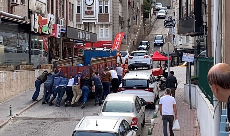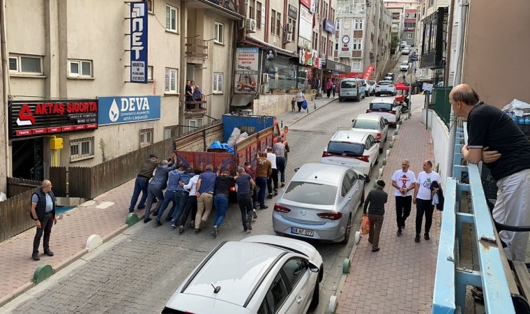 Durumu gören vatandaşlar, kamyoneti iterek yolu trafiğe açmak için seferber oldu. Vatandaşlar, yaklaşık 20 dakika süren çalışmanın ardından kamyoneti iterek yolun kenarına çekti.
