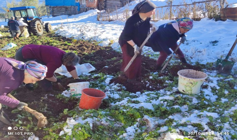 Artvin’in Şavşat ilçesine bağlı, 2 bin rakımlı Şenköy köyünde kış hazırlıkları sürerken, mevsim normallerinin dışında yağan kar köylüleri zorlu bir sürece soktu. Patates hasadı için hazırlık yapan köylüler, tarlalarının karla kaplanması üzerine büyük bir mücadele vererek ürünlerini topraktan çıkarmaya çalışıyor.