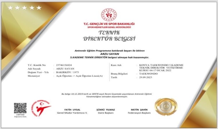 Sporculuğunda bir çok başarıya imza atan, Dünya ve Avrupa Şampiyonu olan, Olimpiyat üçüncülüğü elde eden milli TaeKwonDo’cu Arzu Tan Sayan; aynı başarısını antrenörlükte de sürdürüyor. TaeKwonDo Federasyonu tarafından düzenlenen teknik direktörlük kursunu başarıyla tamamlayan Arzu Tan Sayan, Kayseri’nin ilk 5. kademeye yükselen bayan teknik direktörü oldu.