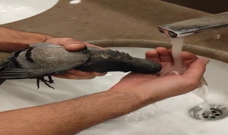 Edinilen bilgiye göre, Fethi Sekin Şehir Hastanesi’nde bir güvercin asansör ile kapısı arasına sıkıştı. Güvercinin sıkıştığını gören bir hastane personeli, kuşu kurtardı. Ardından kuşu lavaboya götüren personel avcuna su doldurdu. Personelin avcundan kana kana su içen güvercin kendine geldi. Personel daha sonra sağlık durumu iyi olan kuşu doğaya geri saldı. O anlar görenlerin içini ısıttı.