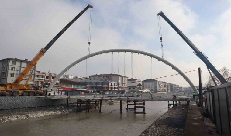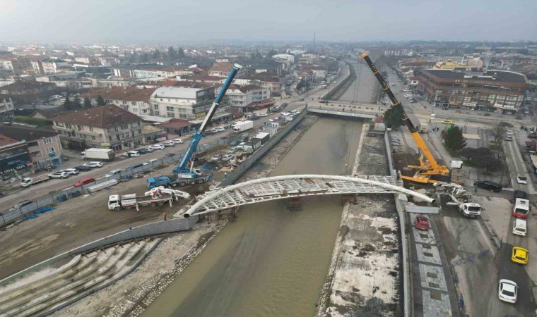Şehre yeni bir kimlik kazandırmak için çaba gösteren Düzce Belediyesi, amfi ile beraber içerisinde restoran, büfe ve yay şeklindeki 2 aktif yaya köprüsünün bulunacağı projede köprü 1’in kemeri geçici halatlarla başarılı şekilde yerleştirildi.