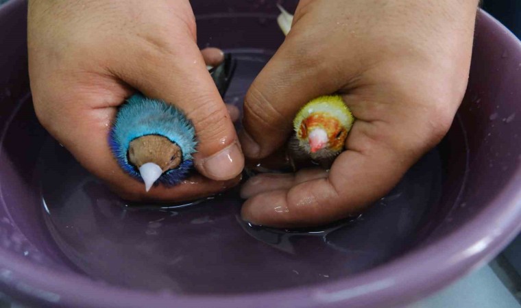 Uzun yıllardır egzotik kuş yetiştiren Emrah Öner, mevsim normalleri üzerinde seyreden hava sıcaklıklarından dolayı rengarenk kuşlarını sıcak yaz günlerinde strese girmemeleri için 2 kere banyo yaptırıyor.
