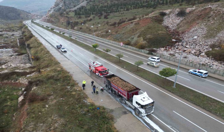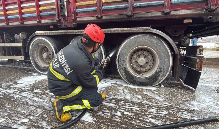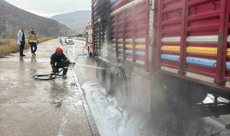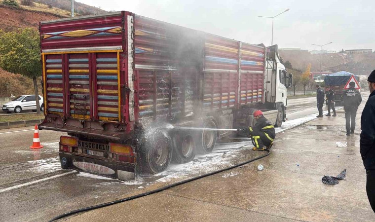 Tokat’ta aşırı yük nedeniyle lastikleri tutuşan tırda çıkan yangın itfaiye ekiplerince söndürüldü.