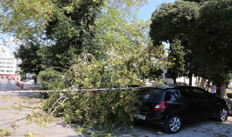 Antalya’da asırlık çınar ağacının kırılan dalı, park halindeki 5 aracın üzerine düştü. Olayda bir yol süpürme aracı ve 4 otomobil hasar gördü.