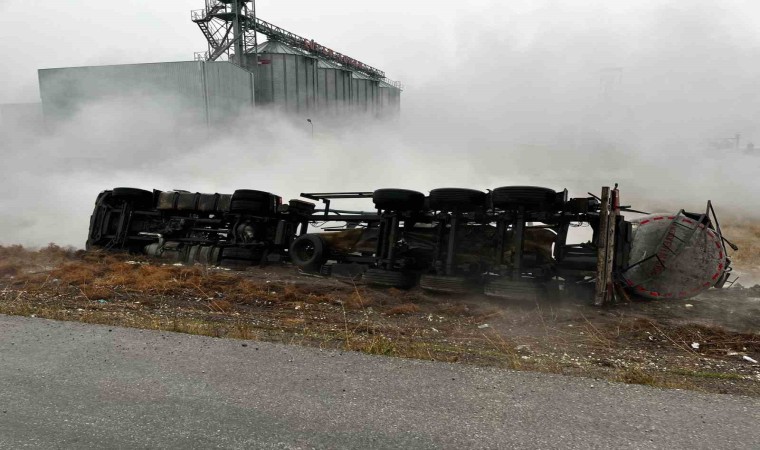 Kaza anı ise bir fabrikanın güvenlik kamerasına yansıdı. Görüntülerde; tankerin yoldan çıkarak devrilmesi, devrildiği esnada dumanların çıkması yer alıyor.