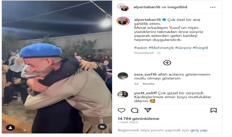 Duygulu anlar sonrası İnegöl Belediye Başkanı Alper Taban, asker kardeş ve genç çiftin yakınları ile birlikte yüzükleri kesti. Bu anı sosyal medya hesabında paylaşan İnegöl Belediye Başkanı Alper Taban, "Çok özel bir ana şahitlik ettim. Mesai arkadaşım Yusuf’un nişan yüzüklerini takmadan önce sürpriz yaparak askerden gelen kardeşi hepimizi duygulandırdı" dedi.