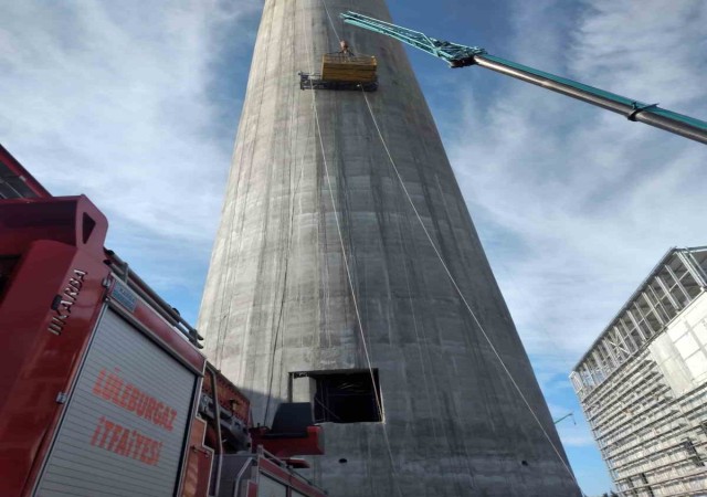 Kırklareli'nde, Lüleburgaz ilçesine bağlı Büyükkarıştıran belediyesindeki Şişecam fabrikasında, 100 metrelik fırın bacasının boyanması için kullanılan asma iskelenin 80 metre yükseklikteki halatının kopması sonucu, iskelede çalışan 2 işçi mahsur kaldı. Haber verilmesi üzerine bölgeye itfaiye, AFAD, jandarma ve sağlık ekipleri sevk edildi. Ekiplerin yaklaşık 2 saat süren müdahalesi sonucunda yaralı işçiler Engin Öner ve Ali İçer iş makinası yardımıyla kurtarıldı. Kurtarılan işçiler, sağlık ekipleri tarafından hemen Lüleburgaz Devlet Hastanesine götürüldü. Olayla ilgili soruşturma başlatıldı.