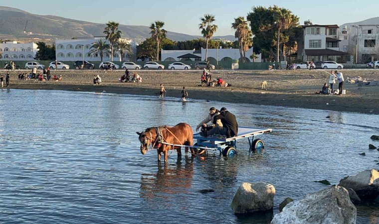 Hatay’da güneşli havanın tadını çıkarmak isteyen 2 kafadar, at arabasıyla denize girerek keyif çattı.