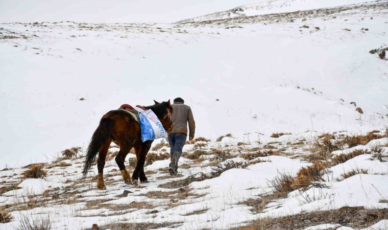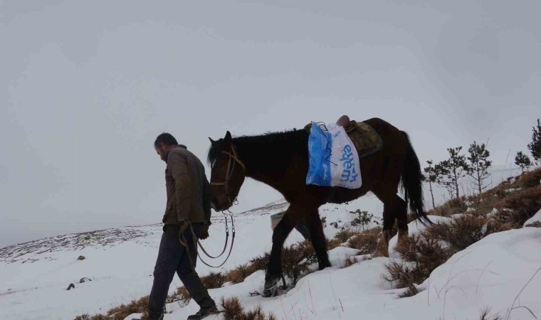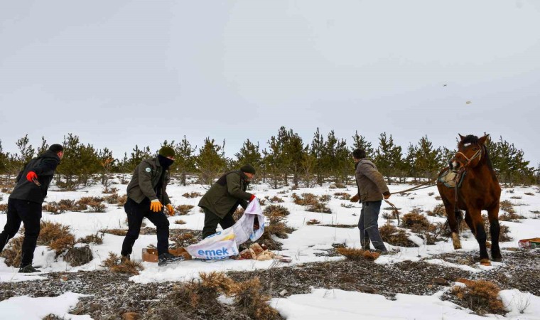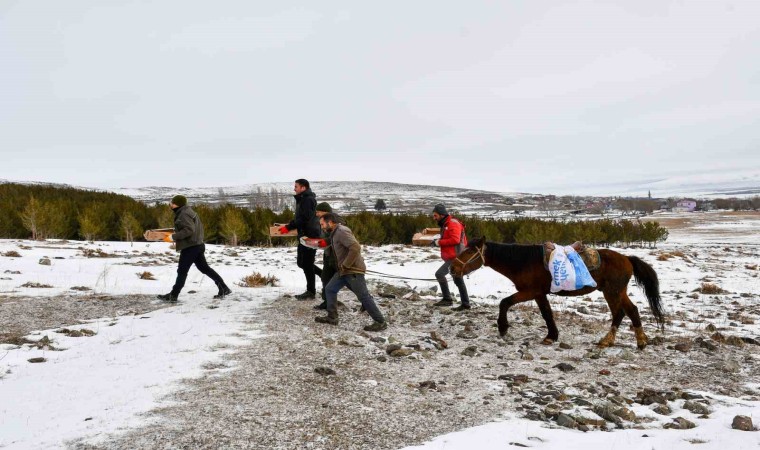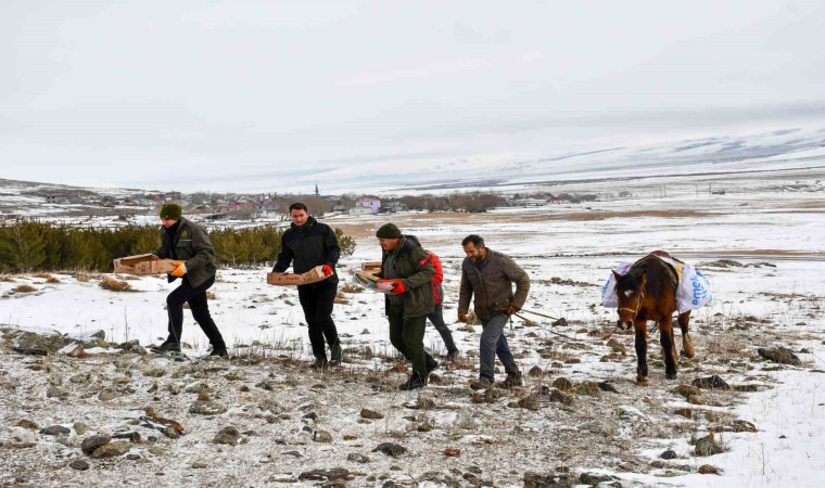 Ardahan’da karla kaplı arazide doğada yem bulmakta güçlük çeken dağdaki yaban hayvanları için at sırtında doğaya yem bırakıldı.