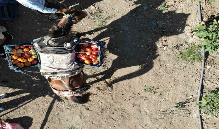 Kahramanmaraş’ta dede yadigarı tohumlardan yetiştirilen ’Bulanık domatesi’ sarp arazilerde hasat edildikten sonra at ve katırlarla taşınıyor.