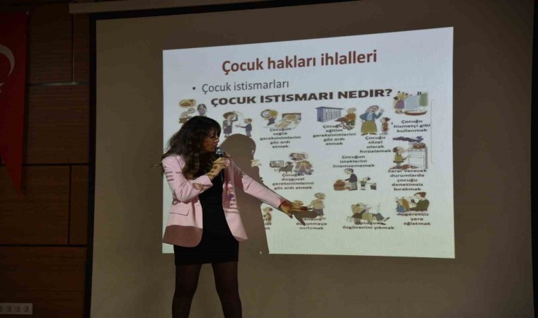 Avukat Fatma Suğanlı öğrencilere yönelik yaptığı konuşmada, “18 yaş altı herkes çocuktur ve bazı hakları vardır. Bütün haklarımız, kanunlarca düzenlenir. Bu noktada sizin korunmanız da kanunlarca düzenlenmektedir. Çocuk hakları sözleşmemiz var ve sözleşmede ‘18 yaşından küçük herkes çocuktur’ diyor. Çocuk hakları, hem kanunen hem de ahlaken korunması gereken haklardır. Doğuştan sahip olduğumuz eğitim, sağlık, yaşama, barınma, fiziksel, psikolojik veya cinsel her türlü istismar ve ihmale karşı korunma gibi haklarınızı sağlamaktadır. Çocuk hakları eğitimi, çocuklara hakları ihlal edildiğinde ne yapılması gerektiğini gösterir ve tüm insanların haklarının içtenlikle korunmasını sağlar” ifadelerini kullandı.
