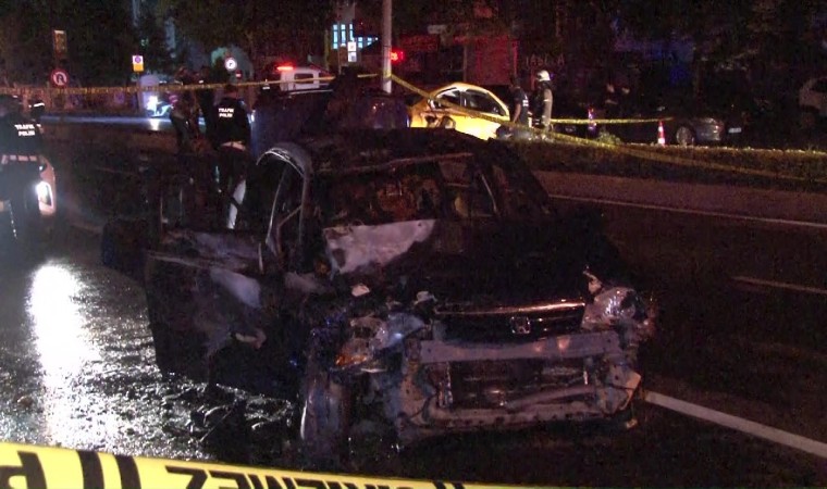Ataşehir’de aşırı hız yapan otomobil, dönüş yapmakta olan ticari taksiye çarptı. Taksinin metrelerce sürüklendiği, diğer otomobilin ise yanarak kullanılamaz hale geldiği kazada üç kişi yaralandı.
