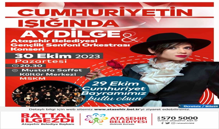 Cumhuriyetimizin 100. yıl coşkusu 29 Ekim kutlamalarının ardından Ataşehir’de devam edecek. 29 Ekim Pazar günü on binlerce vatandaşın katılımı ile gerçekleşecek fener alayı yürüyüşü ve Sertab Erener konserinin ertesinde 30 Ekim Pazartesi günü de Ataşehir Belediyesi Gençlik Senfoni Orkestrası ile Pop müziğin güçlü sesi Aydilge birlikte bir konser verecekler.